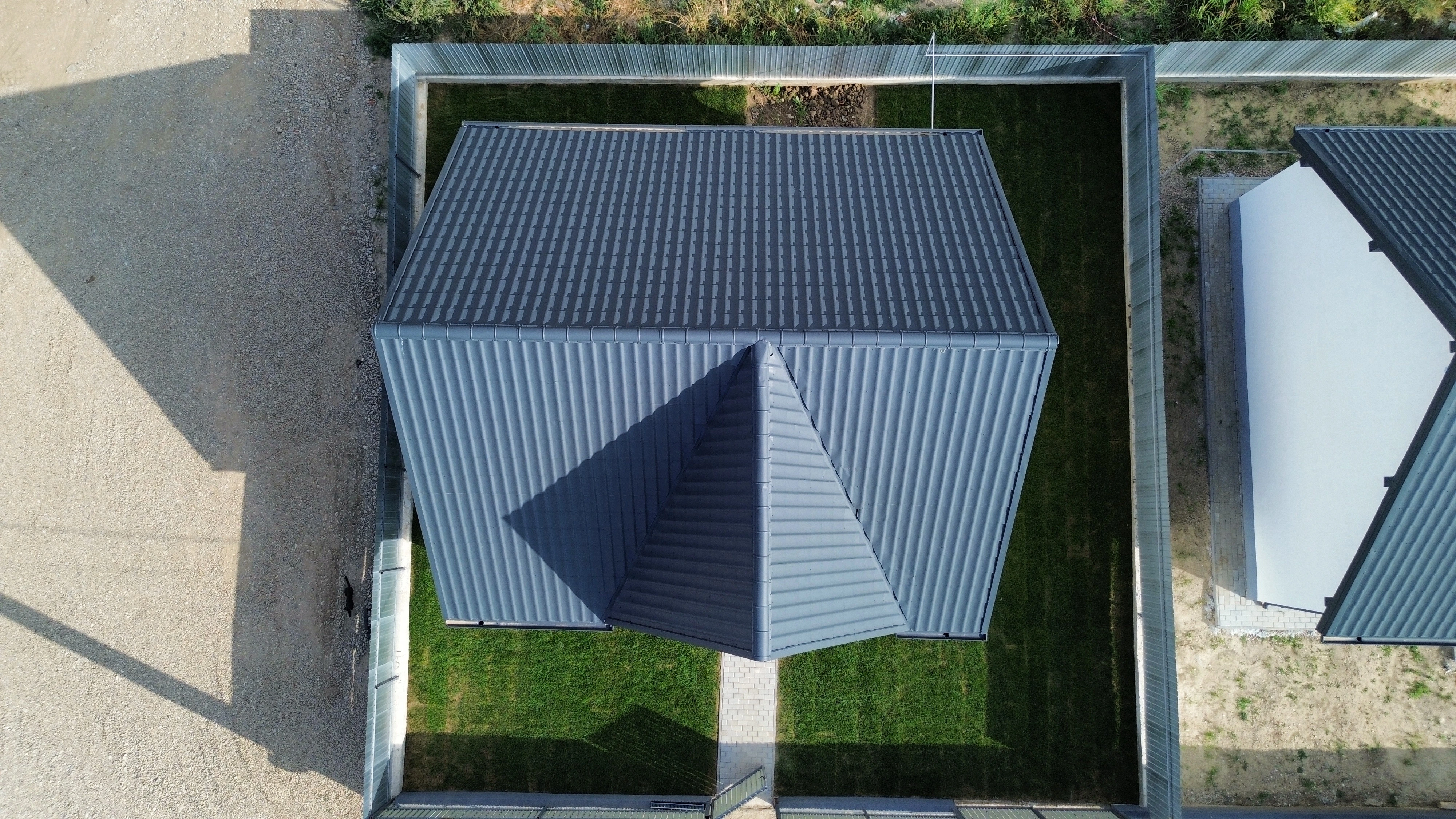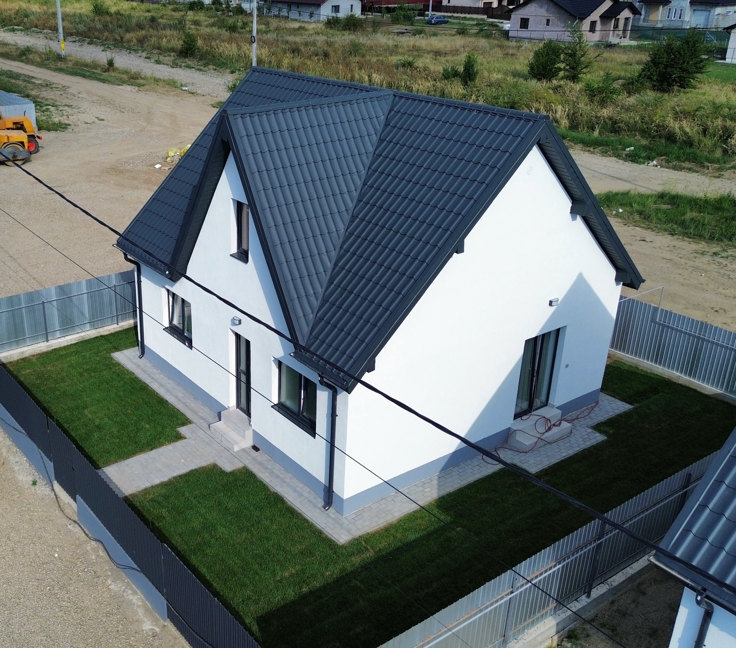 Fiecare casă este echipată cu tablă tip Lindab pentru acoperiș, un material durabil și rezistent la intemperii.